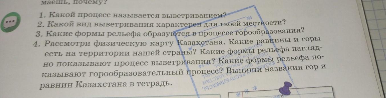 2. Какой вид выветривания характерен для твоей местности?(Казахстан,ВКО,Урджар) 3. Какие формы рельефа образуются в процессе горообразования?