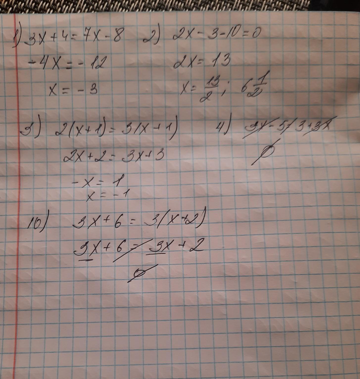 3х+4=7х-8: 7)2х-3-10; 8) 2(х+1) = 3(х+1); 9) 3х -5= 3+3х; 10) 3х+6=3(х+2).