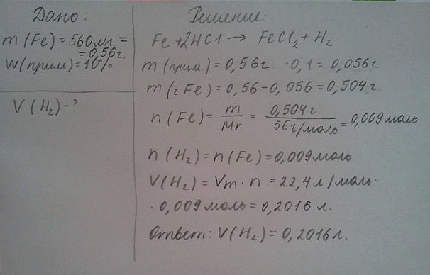 техническое железо массой 560 мг, содержащее 10% примесей, растворили в избытке соляной кислоты. Рассчитайте объем выделившегося водорода (н.у)