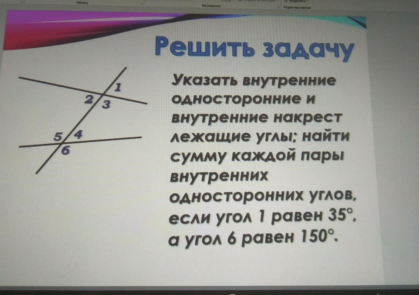 Указать внутренние односторонние и внутренние накрест лежащие углы; Найти сумму каждой пары внутренних односторонних углов. Если угол 1 равен 35°, а угол 6 равен 150°.