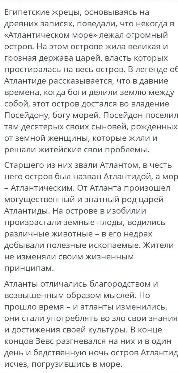 - Цель текста сформулирована в первом предложении: «Египетские жрецы, основываясь на древних записях, поведали, что некогда в «Атлантическом море» лежал огромный остров».