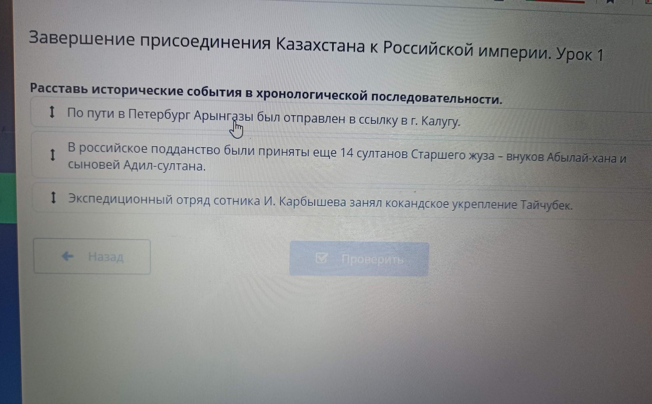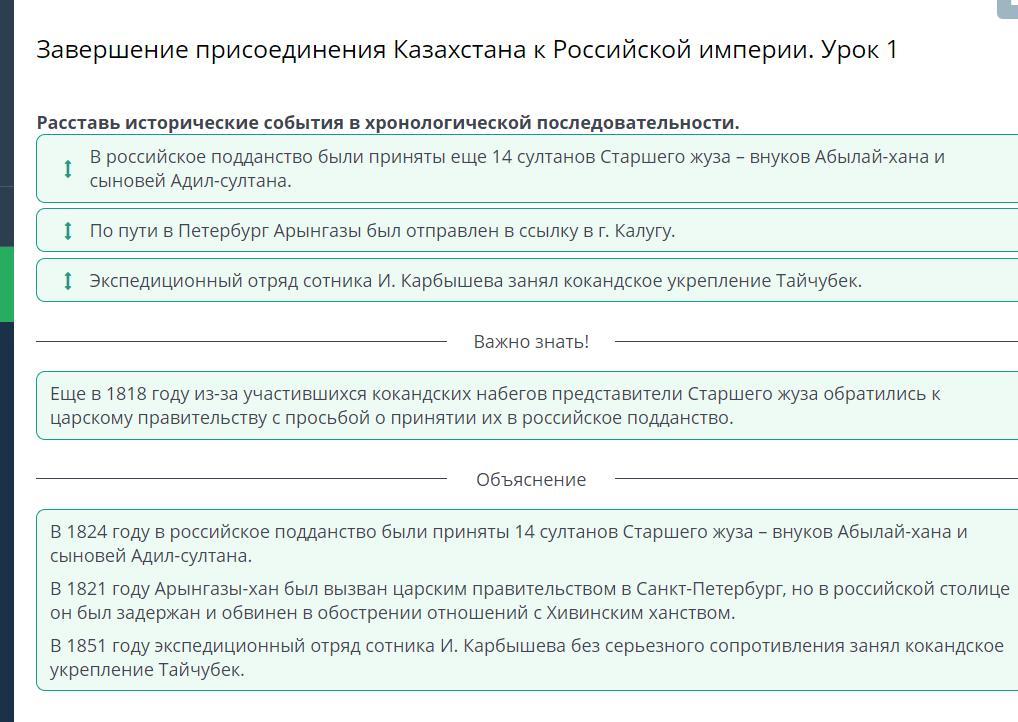 Расставь исторические события в хронологической последовательности. 1 По пути в Петербург Арынгазы был отправлен в ссылку в г. Калугу. 1 В российское подданство были приняты еще 14 султанов Старшего жуза – внуков Абылай- сыновей Адил-султана. 1 Экспедиционный отряд сотника И. Карбышева занял кокандское укрепление Тайчубек.