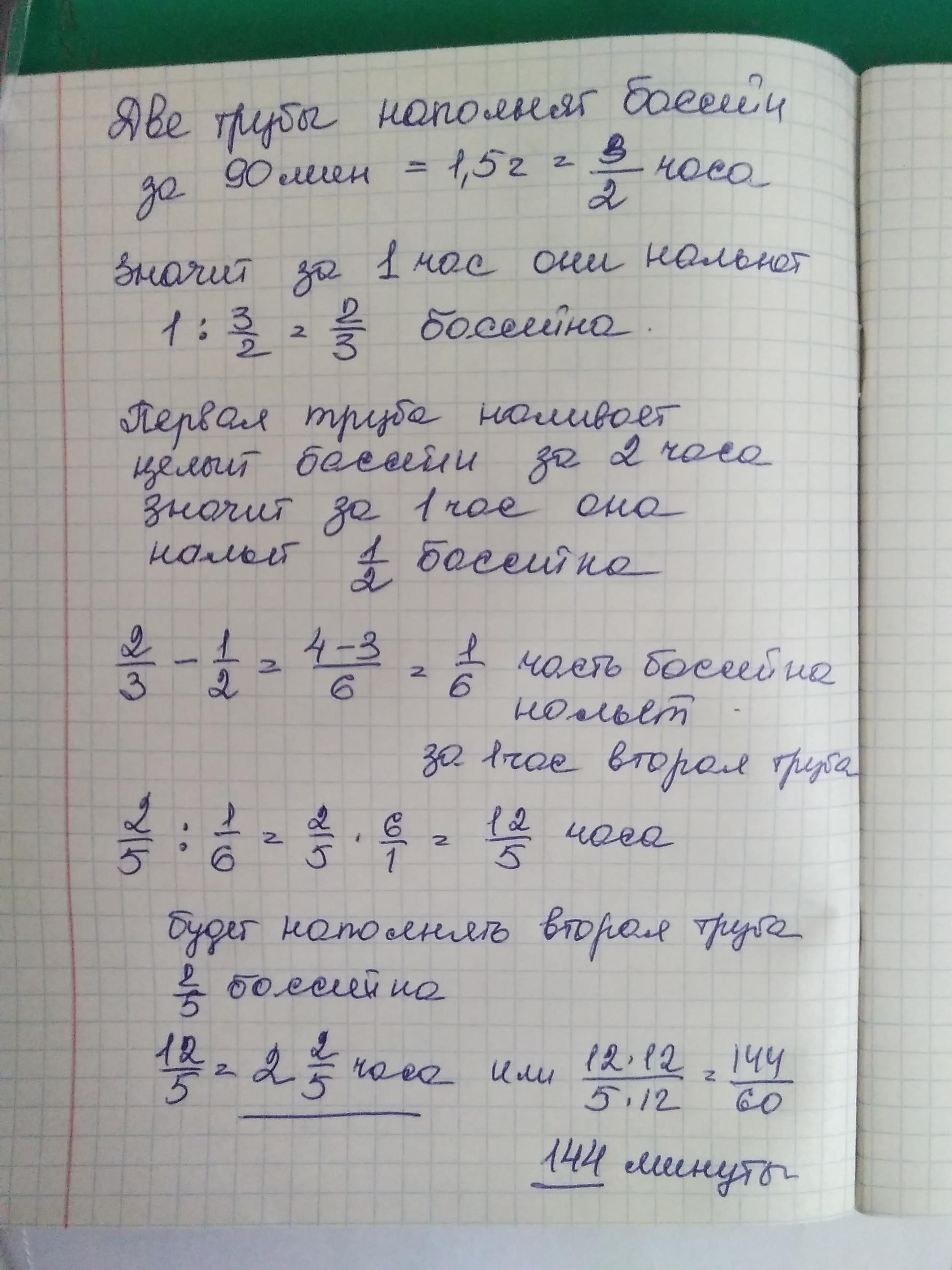 бассейн заполняется 2 трубами одновременно бассейн они заполняют за 90 мин первая труба заполнит бассейн за 2 часа за сколько времени вторая труба заполнит 2/5 бассейна дайте ответ в виде смешанного числа и минут
