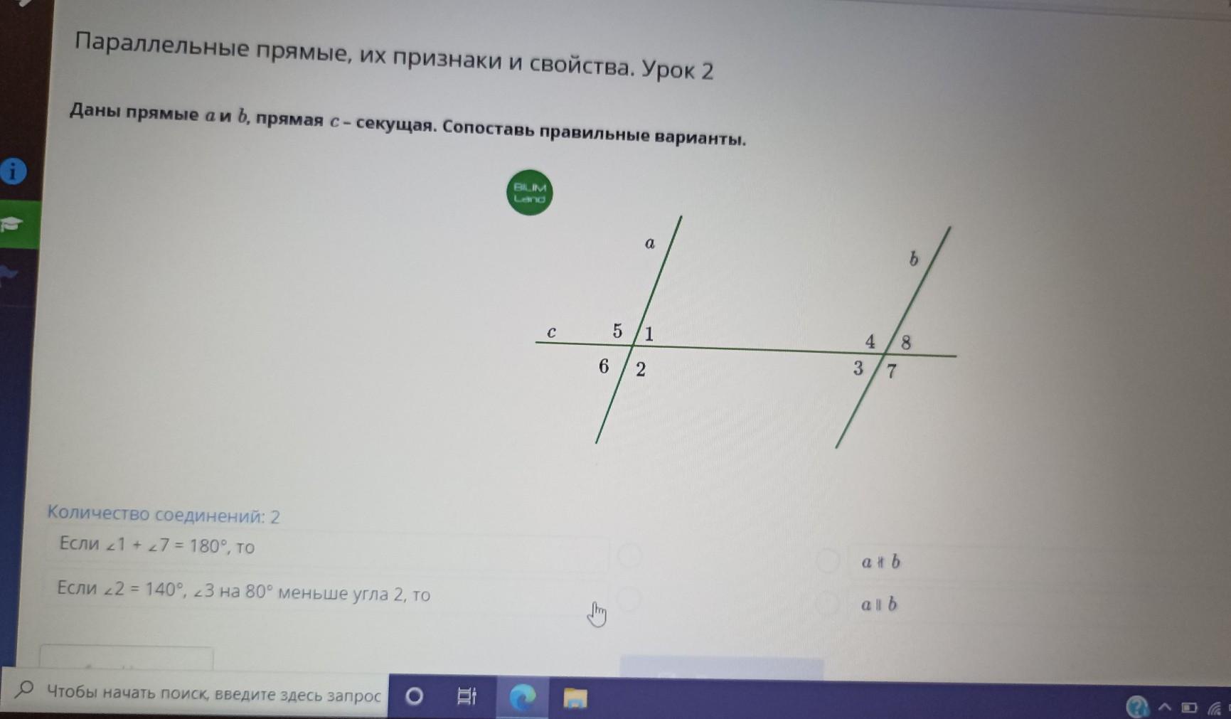 Параллельные прямые, их признаки и свойства. Урок 2 Даны прямые аи b, прямая с- секущая. Сопоставь правильные варианты. БМ LNo b 5/1 4/8 3 / 7 6 / 2 Количество соединений: 2 Если 41 + 7 = 180°, то а Б alb Если 22 = 140°, 43 на 80° меньше угла 2.
