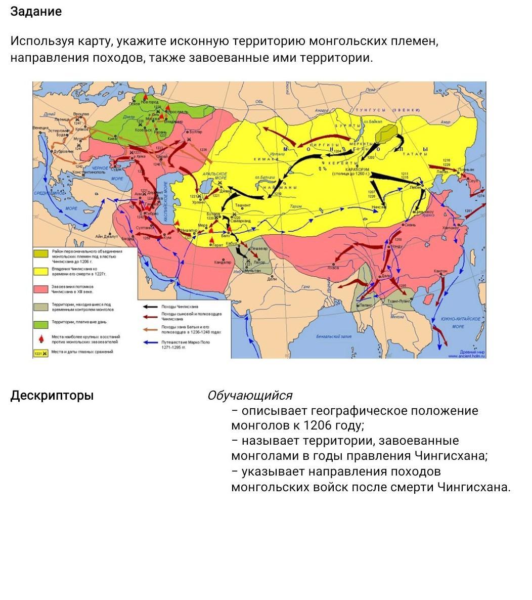 Используя карту, укажите исконную территорию монгольских племен, направления походов, также завоеванные ими территории.