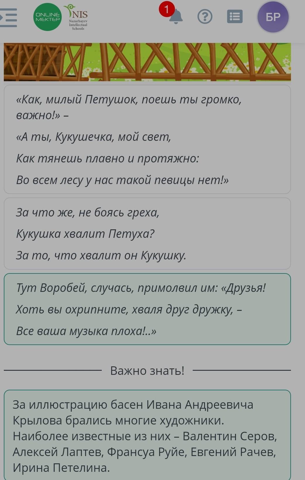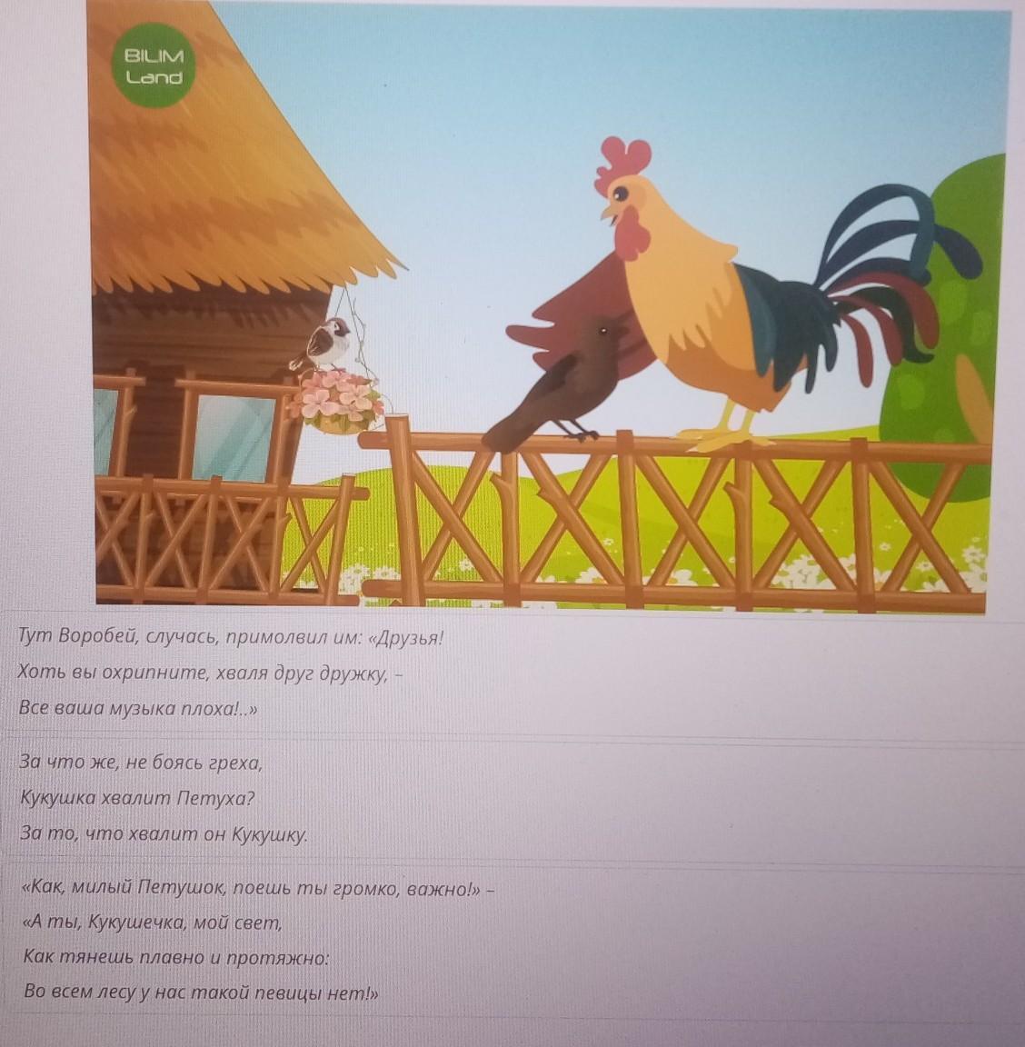 Аомогите даю 20 баллов Какая из цитат басни «Кукушка и Петух» подходит к иллюстрации? BILIM Land XXX, Тут Воробей, cлyчaсь, примолвил им: «Друзья!
