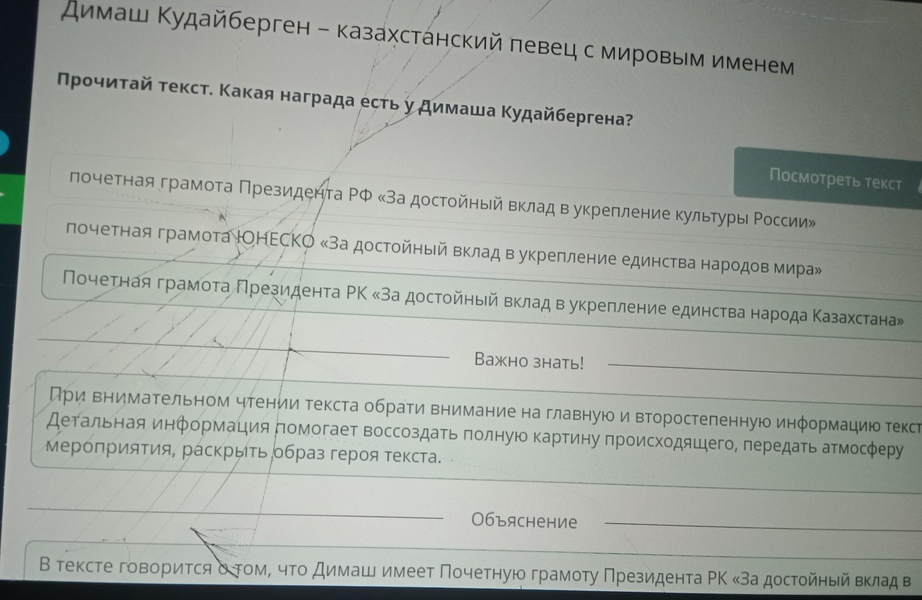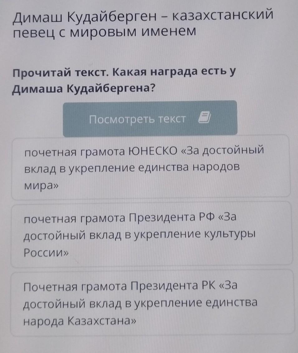 - Димаш Кудайберген – казахстанский певец с мировым именем Прочитай текст. Какая награда есть у Димаша Кудайбергена? Посмотреть текст Почетная грамота ЮНЕСКО «За достойный вклад в укрепление единства народов Мира» Почетная грамота Президента РФ «За достойный вклад в укрепление культуры России» Почетная грамота Президента РК «За достойный вклад в укрепление единства народа Казахстана»