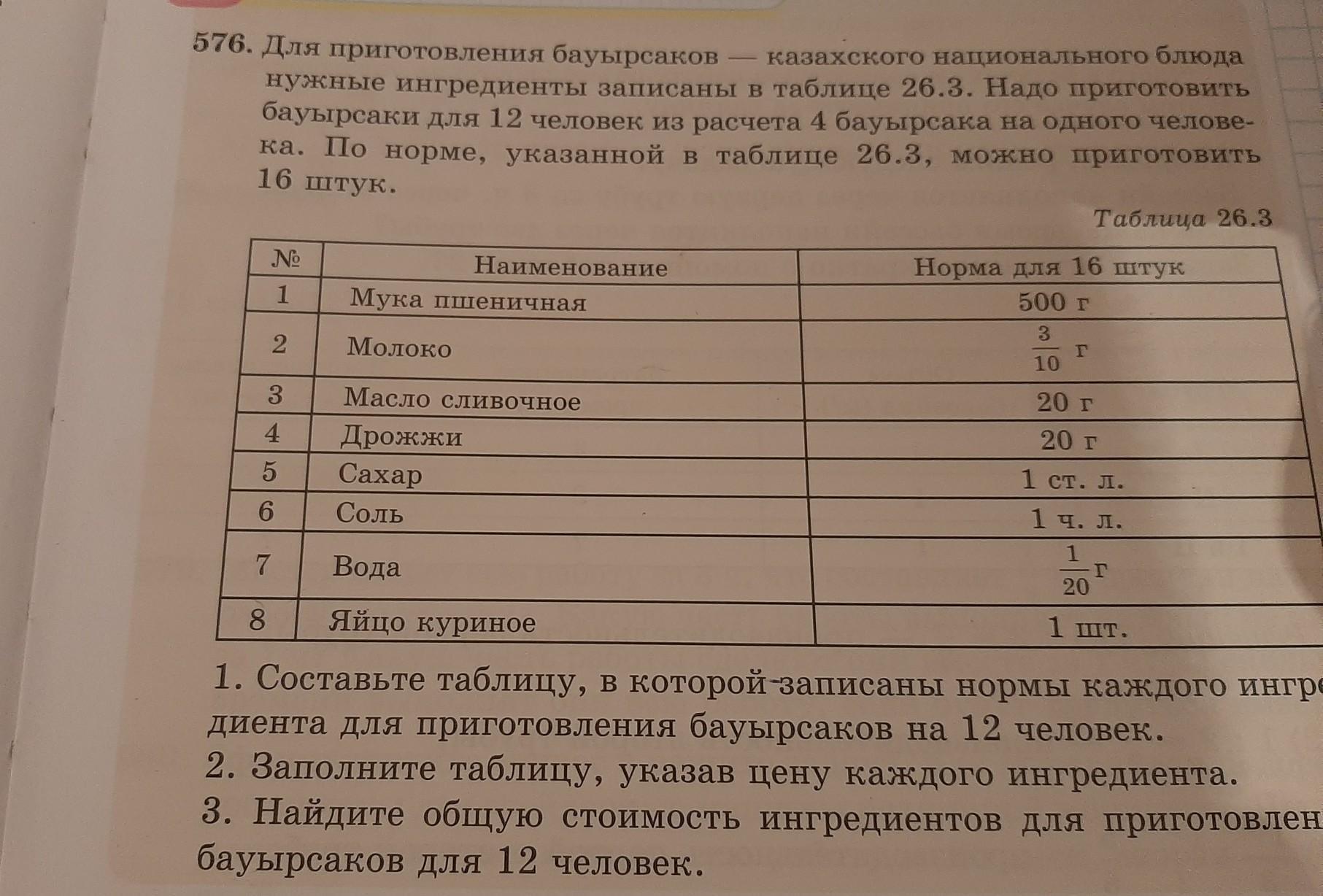 д- Математика в профессии повара 576. Для приготовления бауырсаков - казахского национального блода пукные ингредиенты аашсаны в таблице 26.3. Надо приготовить бауырсаки для 12 человек на расчета 4 бауырсака на одного челоnе- ка. По норме, указанной в таблице 26.3, можно приготовить 16 штук, Таблица 20,3 Наименование Мука пшеничная 2 Норма для 10 штуге 500 г 3 10 2 Молоко 20 г 3 20 г Масло сливочное Дрожжи Caxap Соль 5 6 1 ст. л. 1 ч. л. 1 30 7 Вода 1 шт. 8 Яйцо куриное 1. Составьте таблицу, в которой -записаны нормы каждого ингре- диента для приготовления бауырсаков на 12 человек. 2. Заполните таблицу, указав цену каждого ингредиента. 3. Найдите общую стоимость ингредиентов для приготовления бауырсаков для 12 человек.