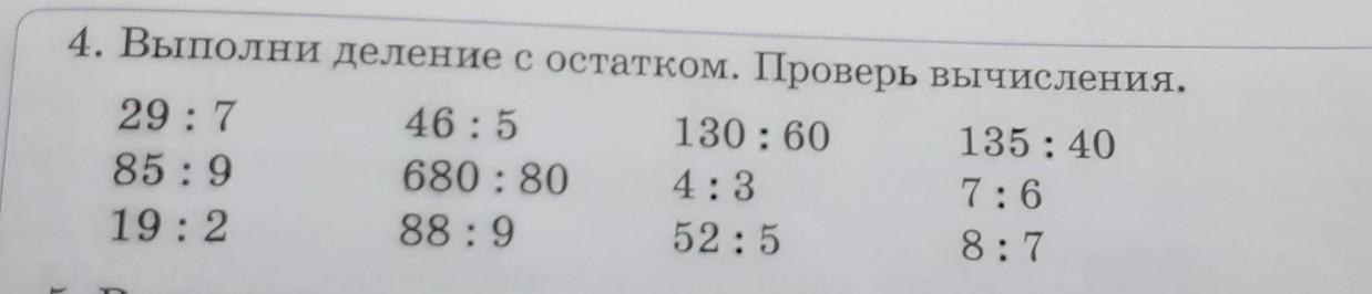 4. Выполни деление с остатком. Проверь вычисления. 29:7 46:5 130 : 60 135 : 40 85:9 680: 80 4:3 7:6 19:2 88:9 52:5 8:7