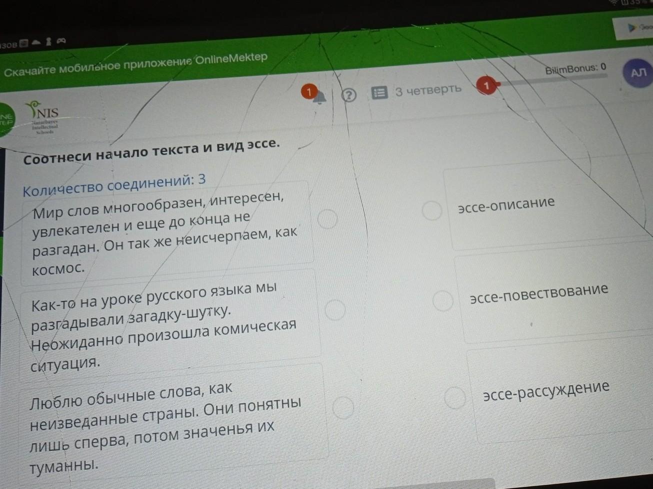 Соотнеси начало текста и вид эссе. Количество соединений: 3 Мир слов многообразен, интересен, увлекателен и еще до конца не разгадан. Он так же неисчерпаем, как Космос. эссе-описание эссе-повествование Как-то на уроке русского языка мы разгадывали загадку-шутку. Неожиданно произошла комическая ситуация. Люблю обычные слова, как неизведанные страны. Они понятны лишь сперва, потом значенья их туманны. эссе-рассуждение