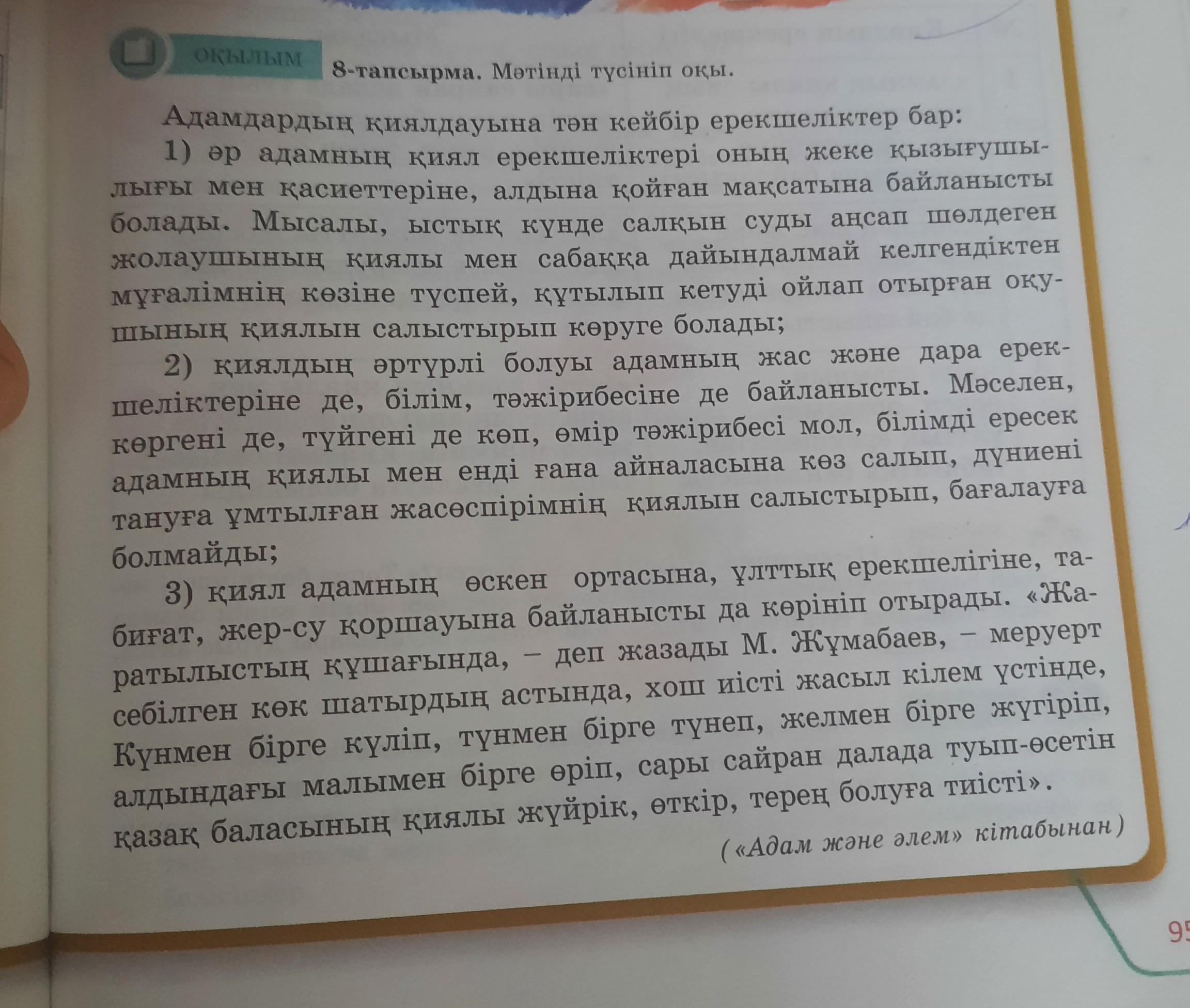 9-тапсырма. Мәтін мазмұны бойынша жоспар құрып жаз. Ол үшін мoтіндегі ор болікке тақырып қой. Тақырыптың тұсына сол бөліктің ішіндегі тірек сөздерді жаз. Тірек сөздердің үндестік заңына сәйкес айты лу ерекшелігін түсіндір.Қазақ тілі 5сынып