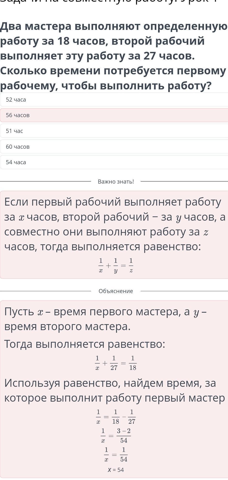 Два мастера выполняют определенную работу за 18 часов, второй рабочий выполняет эту работу за 27 часов. Сколько времени пі табуется первому рабочему, чтобы ВЫП ать работу? 60 часов 54 часа 51 час 52 часа 56 часов