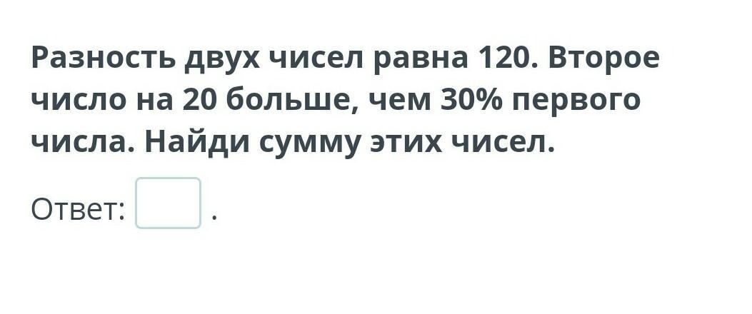 разность двух чисе равна 120 второе чесло на 20больше чем 30%первого числа найди суму этих чисел