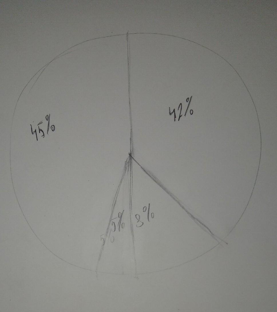 8" у сухій масі рослин вміст вуглецю становить 45 %, кисню 42 %, водню й азоту 8 %, решта 5 % інші речовини. Побудуйте кругову діаграму.Плиииз