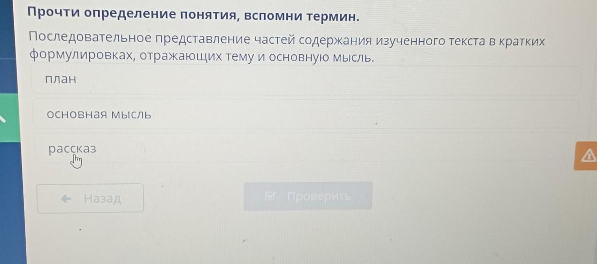 Прочти определение понятия, вспомни термин. Последовательное представление частей содержания изученного текста в кратких формулировках, отражающих тему и основную мысль. План e Основная Мысль рассказ