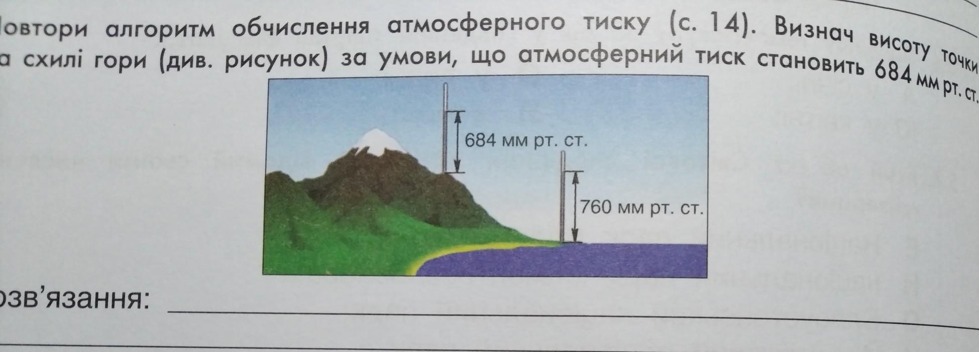 3. Повтори алгоритм обчислення атмосферного тиску (с. 14). Визнач висоту точки на схилі гори (див. рисунок) за умови, що атмосферний тиск становить 684 мм рт. ст. 684 мм рт. ст. 760 мм рт. ст.