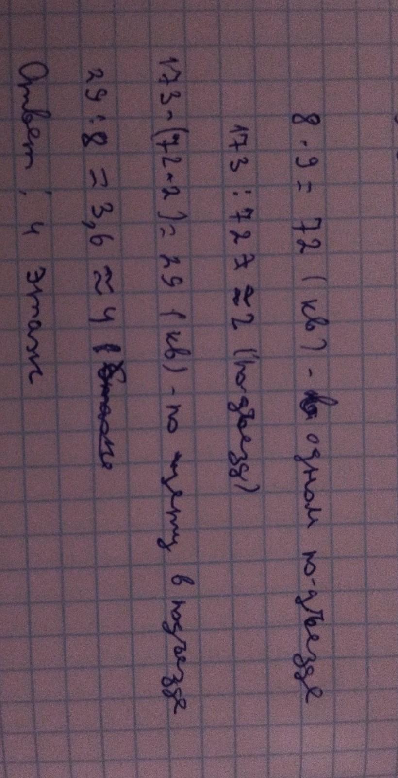 В каждом подъезде на каждом этаже девятиэтажного дома расположенного по восемь квартир. Найдите номер этажа, на котором находится квартира №173.