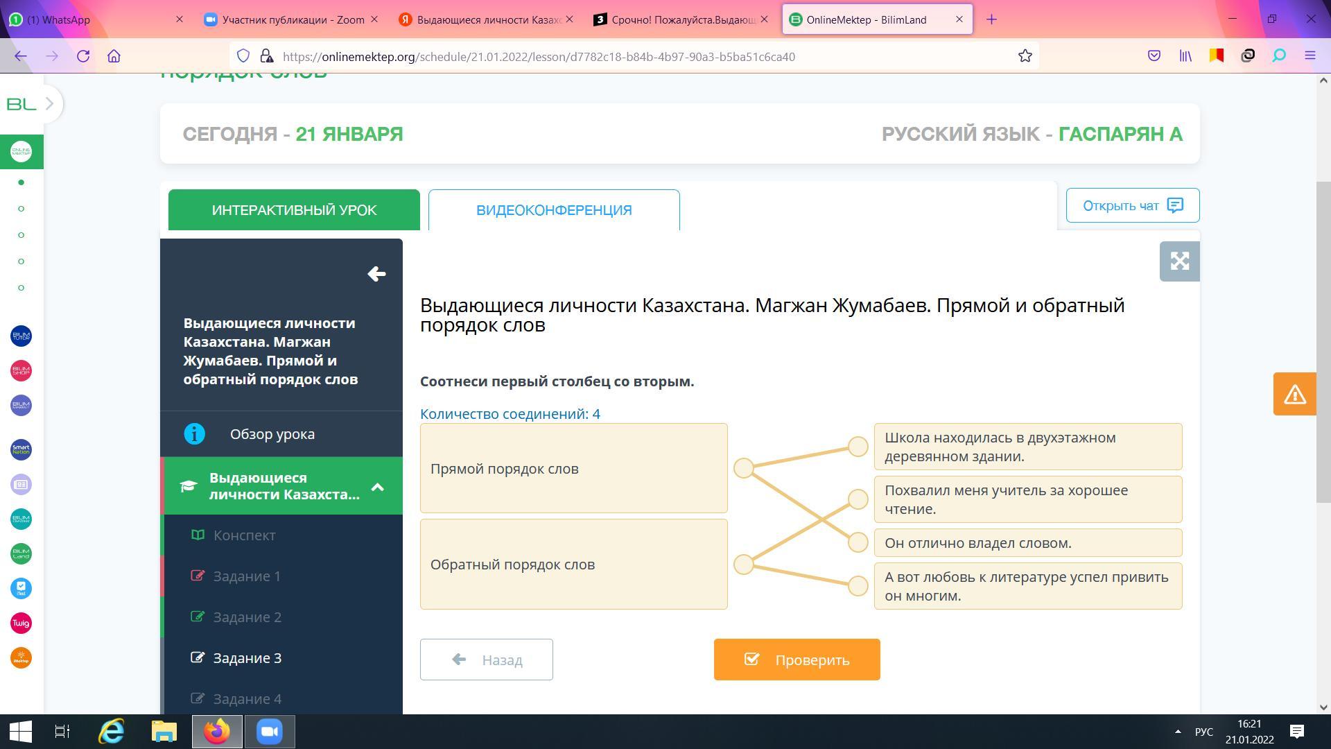 Выдающиеся личности Казахстана. Магжан Жумабаев. Прямой и обратный порядок слов Соотнеси первый столбец со вторым. Количество соединений: 4 Школа находилась в двухэтажном деревянном здании. Прямой порядок слов Похвалил меня учитель за хорошее чтение. Он отлично владел словом. Обратный порядок слов А вот любовь к литературе успел привить ОН МНОГИМ.