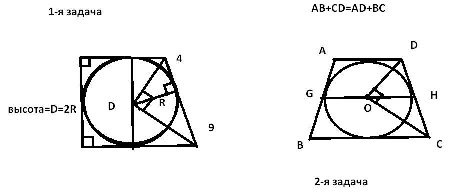 2. Дана описанная прямоугольная трапеция. Вписанная окружность делит точкой касания большую боковую сторону на отрезки, равные 4 см и 9 см. Найдите высоту трапеции.
