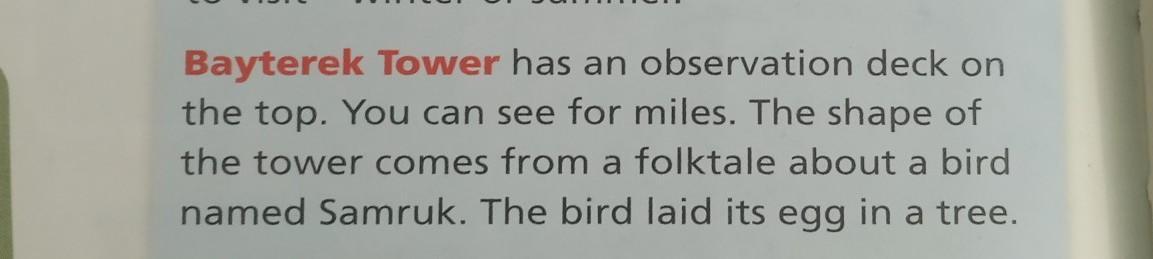 На башне Байтерек есть смотровая площадка. Вы можете видеть за мили. Форма башни происходит из народной сказки о птице по имени Самрук. Птица отложила яйцо на дереве.