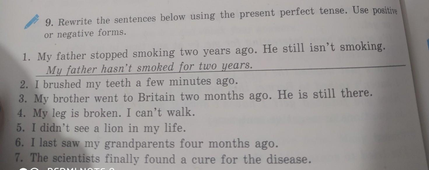 9. Rewrite the sentences below using the present perfect tense. Use positive or negative forms. 1. My father stopped smoking two years ago. He still isn't smoking. My father hasn't smoked for two years. 2. I brushed my teeth a few minutes ago. 3. My brother went to Britain two months ago. He is still there. . My leg is broken. I can't walk. . I didn't see a lion in my life. . I last saw my grandparents four months ago. . The scientists finally found a cure for the disease.