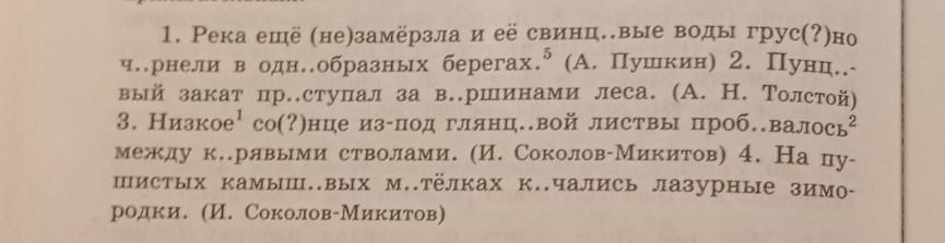 1. Река ещё (не)замёрзла и её свинц..вые воды грус(?) но ч..рнели в одн..образных берегах. (А. Пушкин) 2. Пунц... вый закат пр..ступал за в..ршинами леса. (А. Н. Толстой) 3. Низкое со(?)нце из-под глянц...вой листвы проб..валось между к..рявыми стволами. (И. Соколов-Микитов) 4. На ру- шистых камыш..вых м..тёлках к..чались лазурные зимо- родки. (И. Соколов-Микитов)