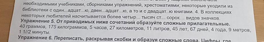 40 граммов,й75 килограммов,5 часов,27 километров,11 литров,45 лет,67 дней,4 года,9 метров,1 1//2 минуты. пожалуйста помогите только упр 5