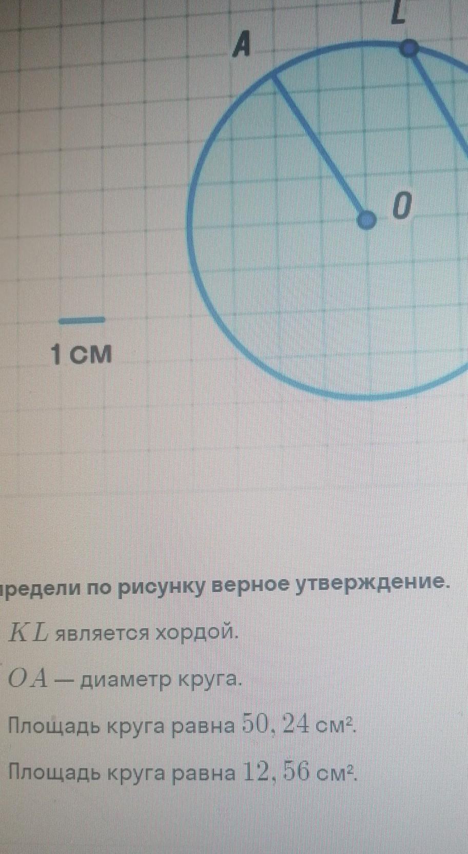 2 A 0 1 CM K Определи по рисунку верное утверждение. KL является хордой. 0А — диаметр круга. Площадь круга равна 50, 24 см2. Площадь круга равна 12, 56 см2.