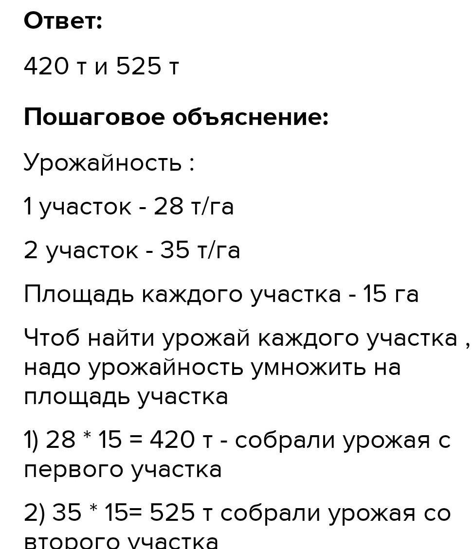 Реши задачу урожайность моркови на одном участке составляет 28 т/га а на другом 35 т/га Какой урожай урожай собрали на каждом участке если под посадку была занята по 15 гектаров Земли