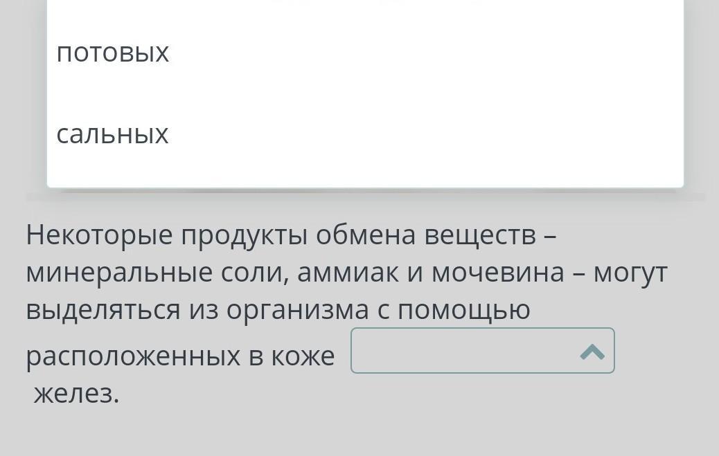 Некоторые продукты обмена веществ – минеральные соли, аммиак и мочевина – могут выделяться из организма с помощью расположенных в коже_____________ желез.