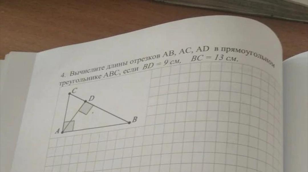 AD = √ ( CD * BD ) = √ ( 4 * 9 ) = 2 * 3 = 6 ( см ) ; AD = 6 см .