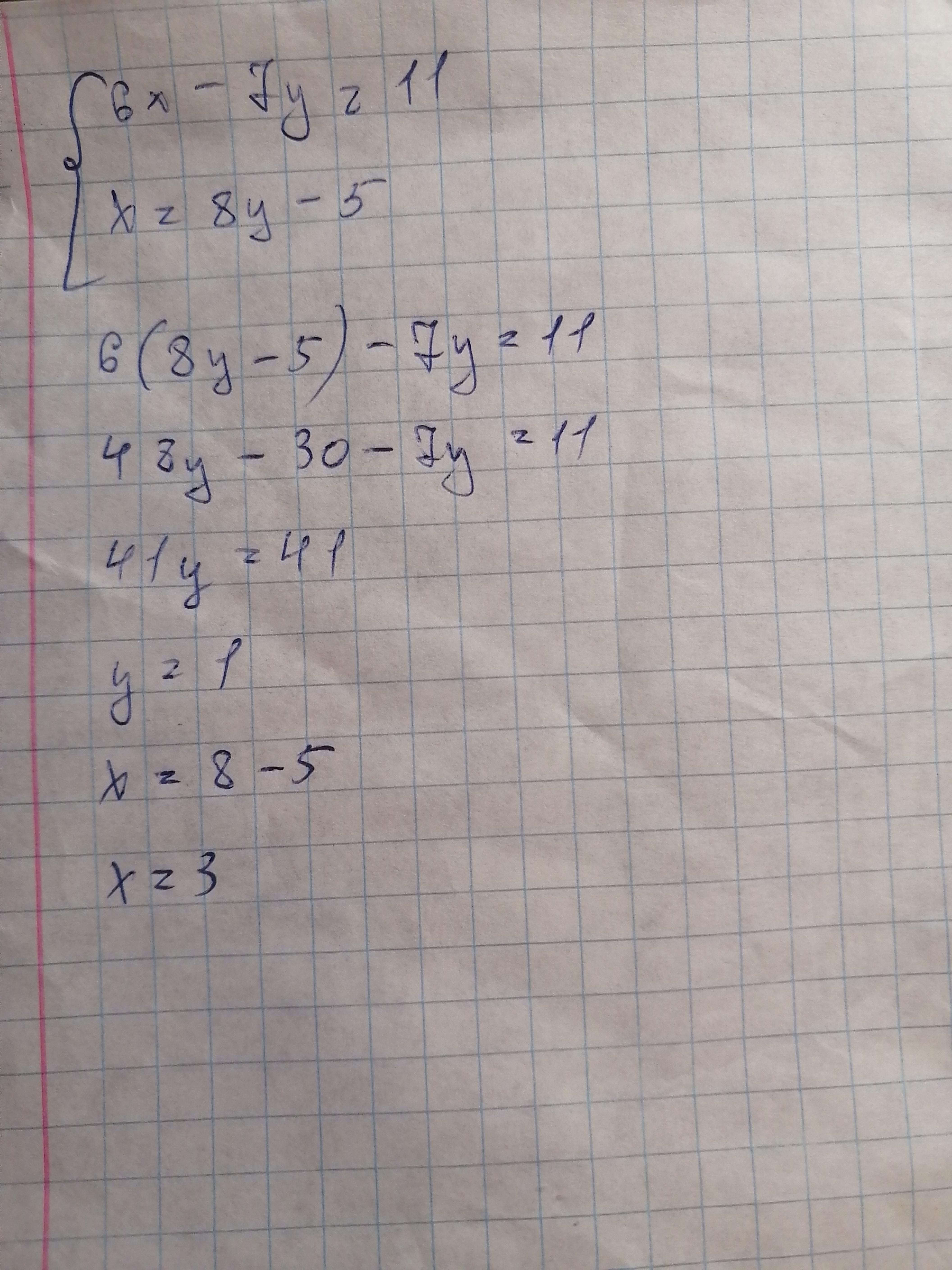 значит нужно подставить выражение 8y - 5 вместо x в первое уравнение 6x - 7y = 11