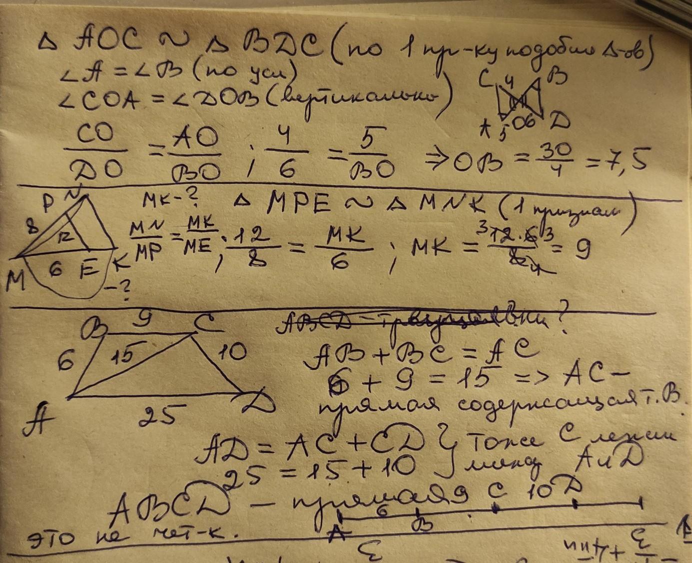 1)ΔСАО~ΔВДО по 2-м углам : ∠А=∠В по условию, ∠СОА=∠ВОД ⇒ сходственные стороны пропорциональны.