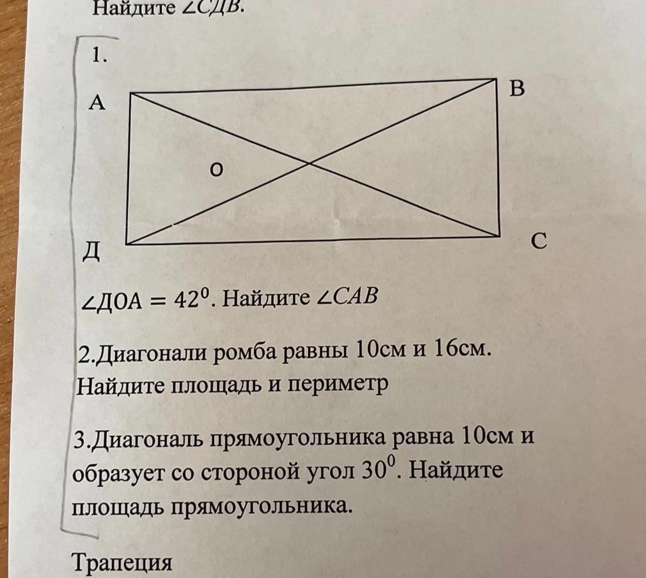3.Диагональ со сторонами образует прямоугольный треуг. , один из острых углов по условию 30, значит катет , лежащий против угла в 30* = 5 Найдем по Пиф. второй катет 100-25=75 длина 5 корней из 3 S= ab=25 корней из 3