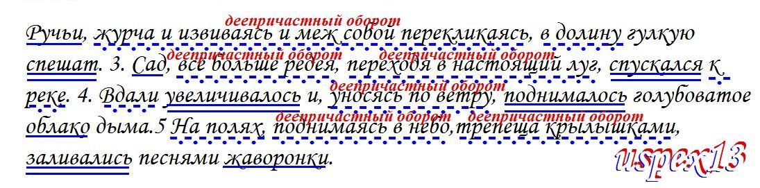 1. Всю ночь гремел овраг соседний, ручей бурля бежал к ручью. 2. Ручьи, журча и извиваясь и меж собой перекликаясь в долину гулкую спешат. 3. Сад, всë больше редея, переходя в настоящий луг, спускался к реке. 4. Вдали увеличивалось и, уносясь по ветру, поднималось голубоватое облако дыма.5 На полях, поднимаясь в небо,трепеща крылышками,заливались песнями жаворонки. НАЙДИТЕ ПОЖАЛУЙСТА Подлежащее Сказуемое и обстоятельство