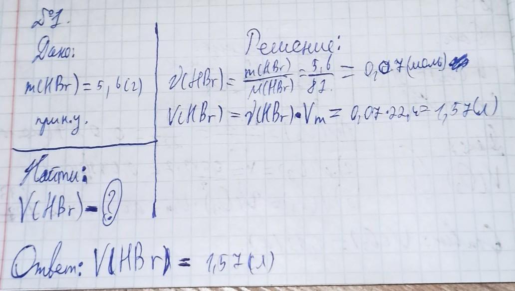 Какой объем при н.у. занимают 5, 6 г бромоводорода HBr?