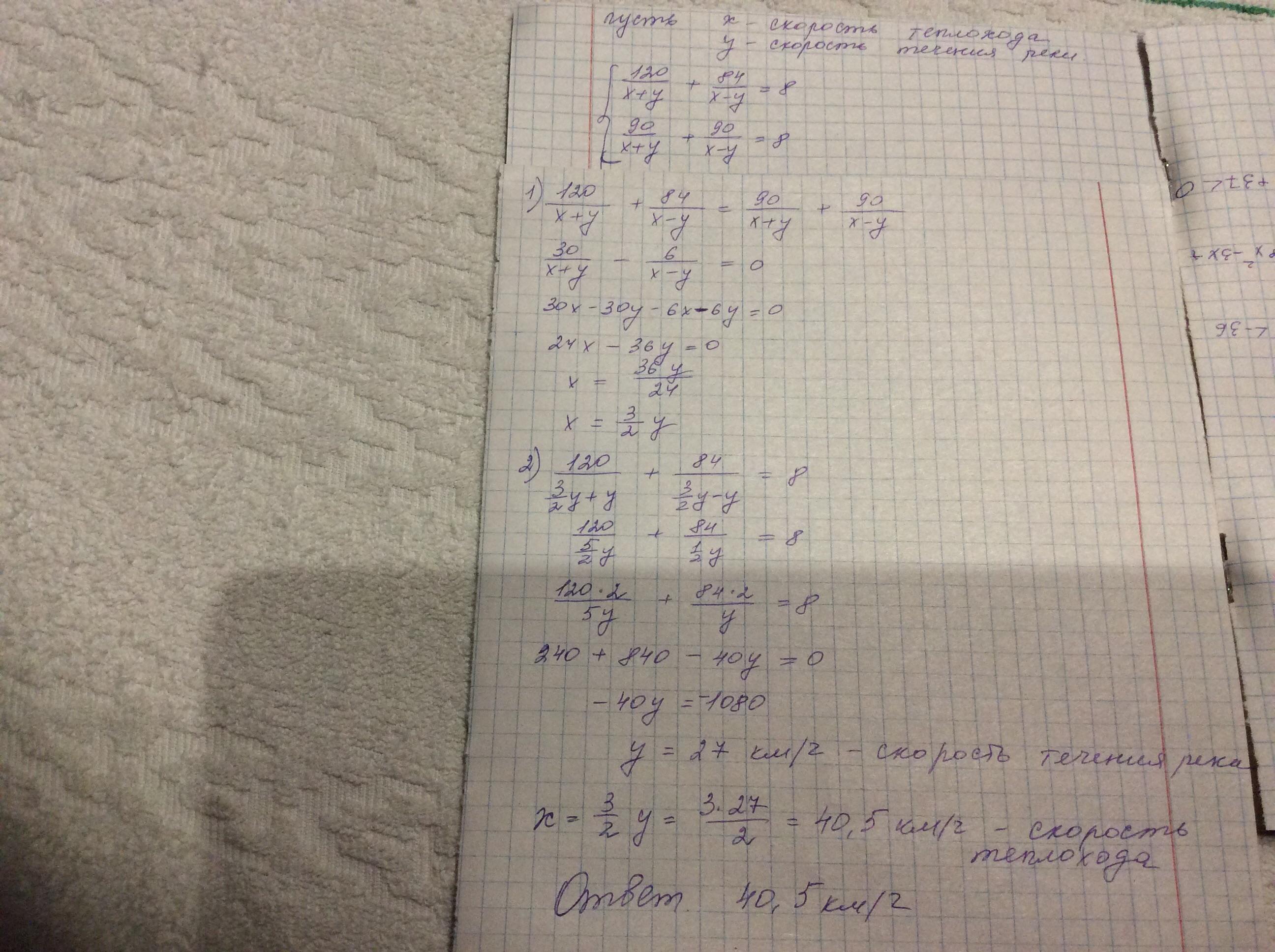 теплоход прошел по течению реки 120км и против течения 84 за 8 часов . за это время он мог пройти по течению 90км и против течения 90км . найдите собственную скорость теплохода