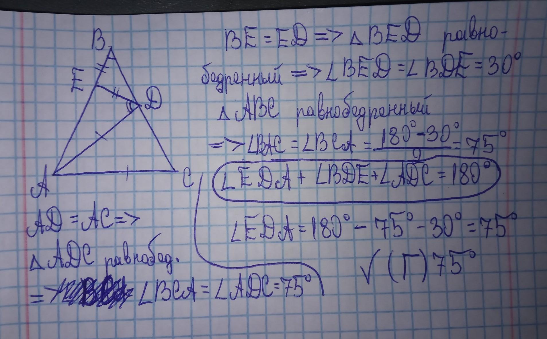На сторонах равнобедренного треугольника ABC с основанием АС отмечены точки Е и D так, что BE=ED и AD=AC. Угол при вершине В равен 30°. Найдите угол EDA.