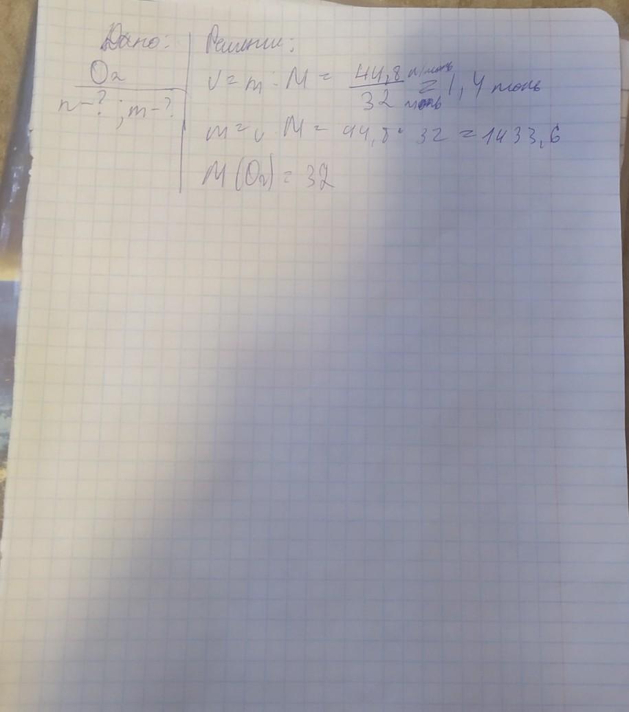 Определить кол-во вещества, число частиц и массу кислорода (О2) занимающего 44,8 литров. С подробным решением!