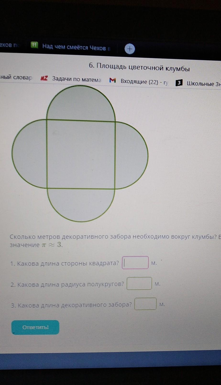 В городе была сделана цветочная клумба ,состоящая из квадрата и 4 полукругов.Площадь клумбы приблизительно равна 160 м².