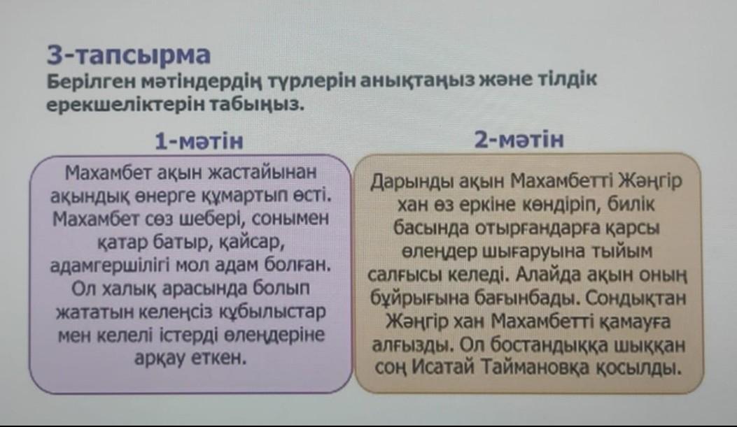 3-тапсырма Берілген мәтіндердің түрлерін анықтаңыз және тілдік ерекшеліктерін табыңыз.