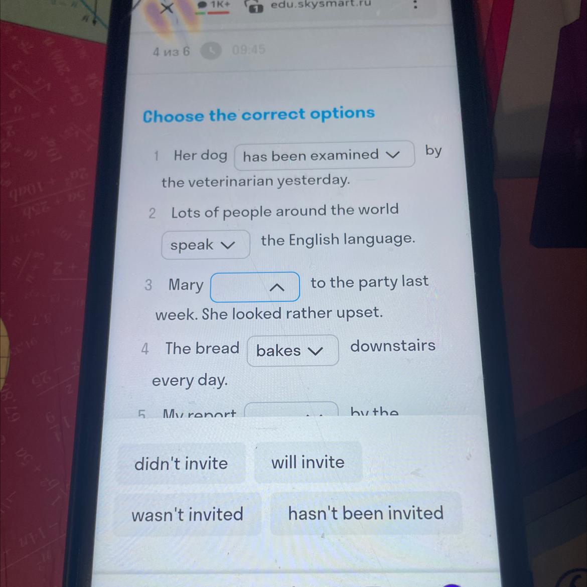 1 was examined 2 speak 3 wasn't invited 4 is baked 5