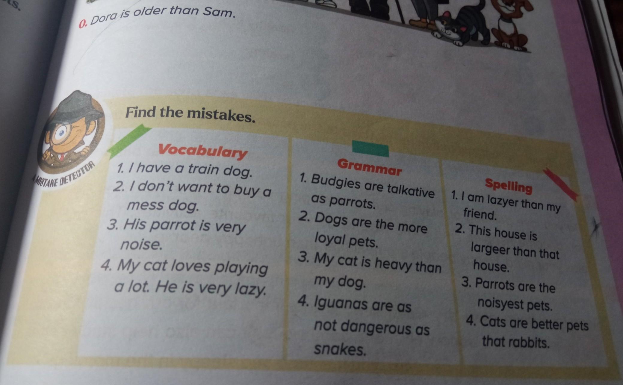 Find the mistakes. CE DETECTOR Vocabulary 1. I have a train dog. 2. I don't want to buy a mess dog 3. His parrot is very noise. 4. My cat loves playing a lot. He is very lazy. Grammar 1. Budgies are talkative as parrots. 2. Dogs are the more loyal pets. 3. My cat is heavy than my dog. 4. Iguanas are as not dangerous as snakes. Spelling 1. I am lazyer than my friend. 2. This house is largeer than that house. 3. Parrots are the noisyest pets. 4 Cats are better pets that rabbits..