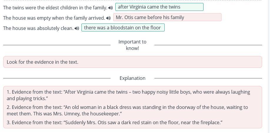 The Canterville Ghost (abstract 2) Click why these statements are not true. The twins were the eldest children in the family. The house was empty when the family arrived. The house was absolutely clean.