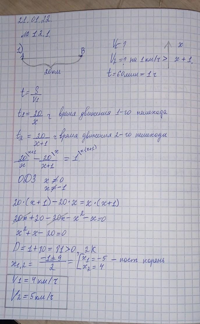 Из города А в город Б, длина пути между которыми 20 км, одновременно вышли два пешехода. Скорость одного из них была 1 км/ч больше скорости другого,