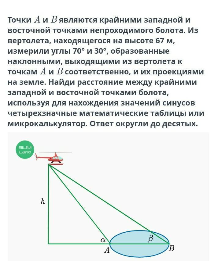 Точки А и В являются крайними западной и восточной точками непроходимого болота. Из вертолета, находящегося на высоте 67 м, измерили углы 70° и 30°, образованные наклонными, выходящими вертолета к точкам А и соответственно, и их проекциями на земле. Найди расстояние между крайними западной и восточной точками болота, используя для нахождения значений синусов четырехзначные математические таблицы или микрокалькулятор. Ответ округли до десятых.