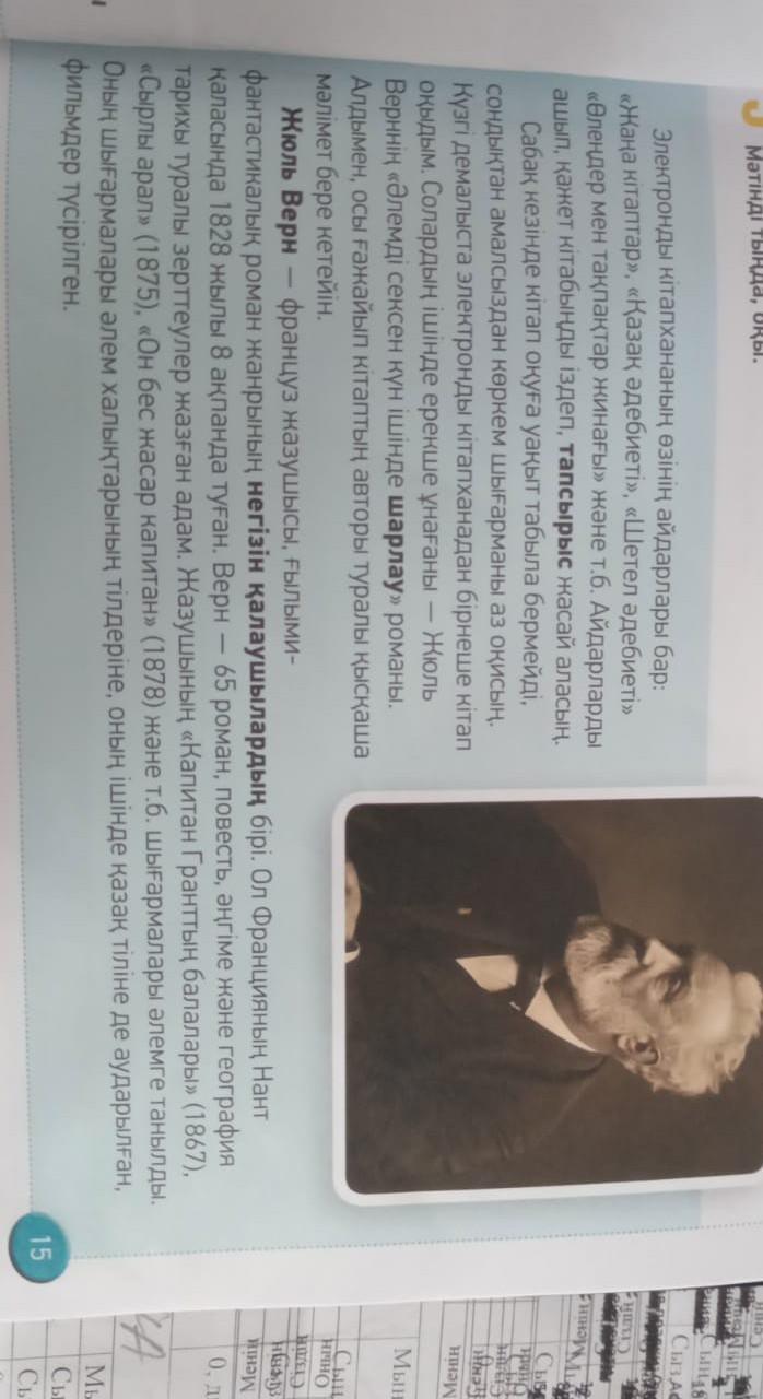 мәТІНМЕН ЖҰМЫС ТЫҢДАЛЫМ оқылым 5 тапсырма. Мәтінді тыңда, оқы. Электронды кітапхананың өзінің айдарлары бар: «Жаңа кітаптар», «Қазақ әдебиеті», «Шетел әдебиеті» «Өлеңдер мен тақпақтар жинағы» және т.б. Айдарларды ашып, қажет кітабыңды іздеп, тапсырыс жасай аласың. Сабақ кезінде кітап оқуға уақыт табыла бермейді, сондықтан амалсыздан көркем шығарманы аз оқисың. Күзгі демалыста электронды кітапханадан бірнеше кітап оқыдым. Солардың ішінде ерекше ұнағаны Жюль Верннің «Әлемді сексен күн ішінде шарлау» романы. Алдымен, осы ғажайып кітаптың авторы туралы қысқаша мәлімет бере кетейін. Жюль Верн - француз жазушысы, ғылыми- фантастикалық роман жанрының негізін қалаушылардың бірі. Ол Францияның Нант қаласында 1828 жылы 8 ақпанда туған. Верн - 65 роман, повесть, әңгіме және география тарихы туралы зерттеулер жазған адам. Жазушының «Капитан Гранттың балалары» (1867), «Сырлы арал» (1875), «Он бес жасар капитан» (1878) және т.б. шығармалары әлемге танылды. Оның шығармалары әлем халықтарының тілдеріне, оның ішінде қазақ тіліне де аударылған, фильмдер түсірілген. 15 ПО ЭТОМУ ТЕКСТУ НУЖНО СОСТАВИТЬ 5 ВОПРОСОВ