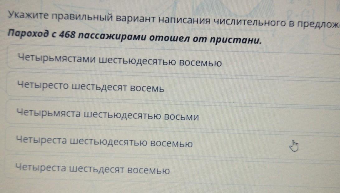 Укажите правильный вариант написания числительного в предложении Пароход с 468 пассажирами отошел от пристани. Четырьмястами шестьюдесятью восемью Четыресто шестьдесят восемь Четырьмяста шестьюдесятью восьми Четыреста шестьюдесятью восемью Четыреста шестьдесят восемью