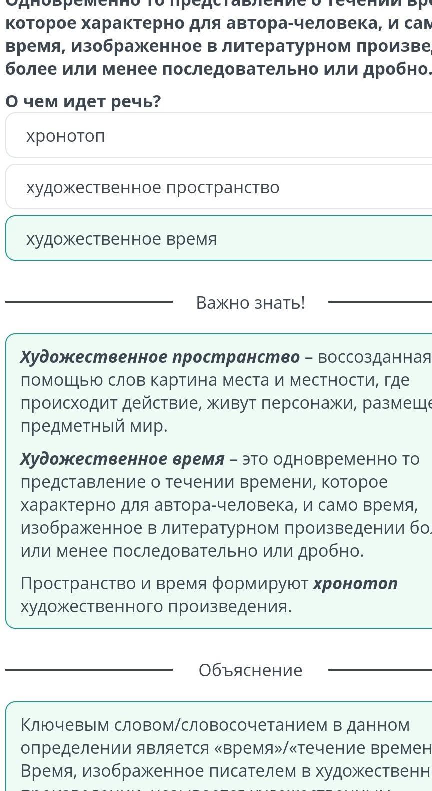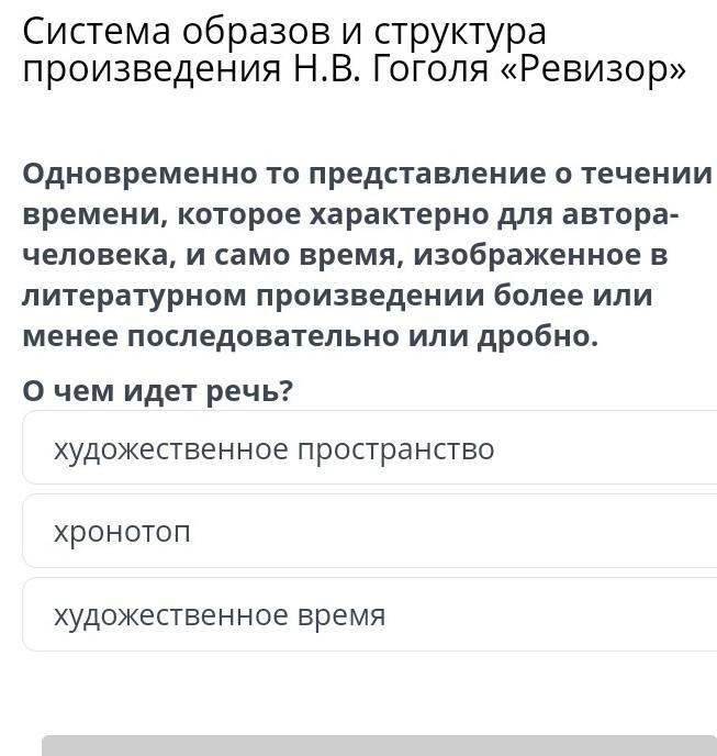 Система образов и структура произведения Н.В. Гоголя «Ревизор» Одновременно то представление о течении времени, которое характерно для автора-человека, и само время, изображенное в литературном произведении более или менее последовательно или дробно. О чем идет речь? художественное пространство хронотоп художественное время
