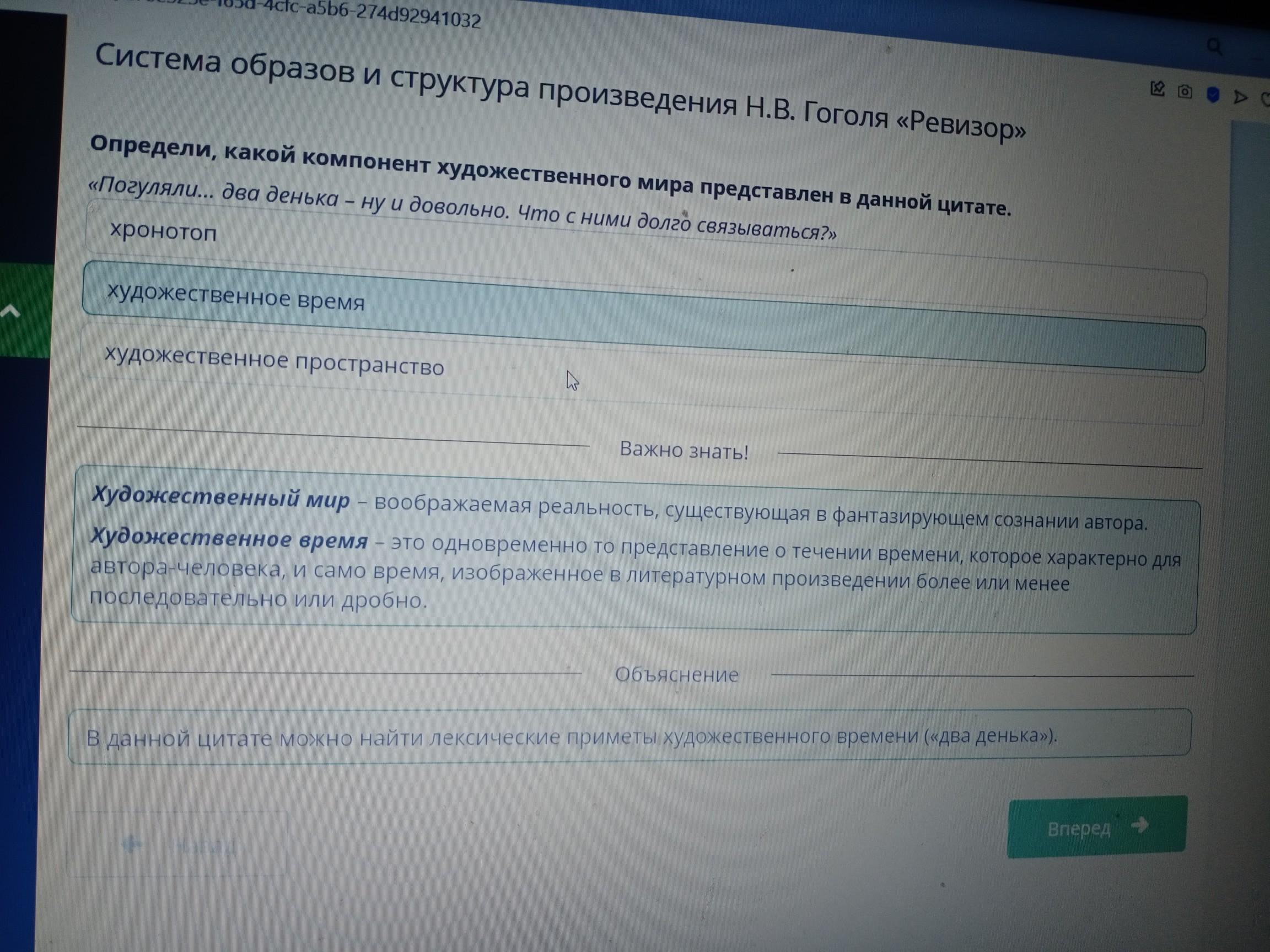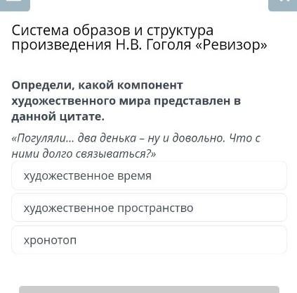произведения Н.В. Гоголя «Ревизор» Определи, какой компонент художественного мира представлен в данной цитате. «Погуляли… два денька – ну и довольно. Что с ними долго связываться?» художественное время художественное пространство хронотоп